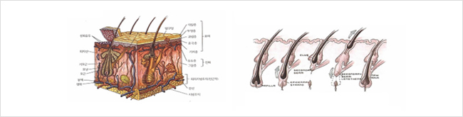 모발의 성장주기는 생장기-퇴행기-휴지기 단계를 거치는데 전체 모발의 약 90%는 생장기에 해당합니다. 생장기는 약2~6년 정도 지속되면 하루에 약 0.35mm, 즉 한 달에 1cm꼴로 성장합니다. 퇴행기는 생장기와 휴지기 사이의 이행시기로 2~4주 정도 입니다. 전체 모발 중 약10%에 해당합니다.