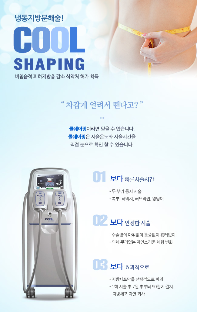 비침습적 피하지방층 감소 식약처 허가 획득 "차갑게 얼려서 뺀다고?" 쿨쉐이핑이라면 믿을 수 있습니다. 쿨쉐이핑은 시술온도와 시술시간을 직접 눈으로 확인 할 수 있습니다.