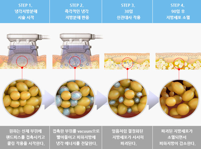 냉각지방분해술이란 지방세포가 냉기에 취약하다는 점을 이용해 지방 조직을 제거하고자 하는 신체 부위에 냉기를 가함으로써, 주변 조직에는 영향을 주지 않고 지방 세포 스스로 자멸(Apoptosis)하도록 유도해 지방 세포를 선택적으로 서서히 제거하는 시술을 말합니다.
